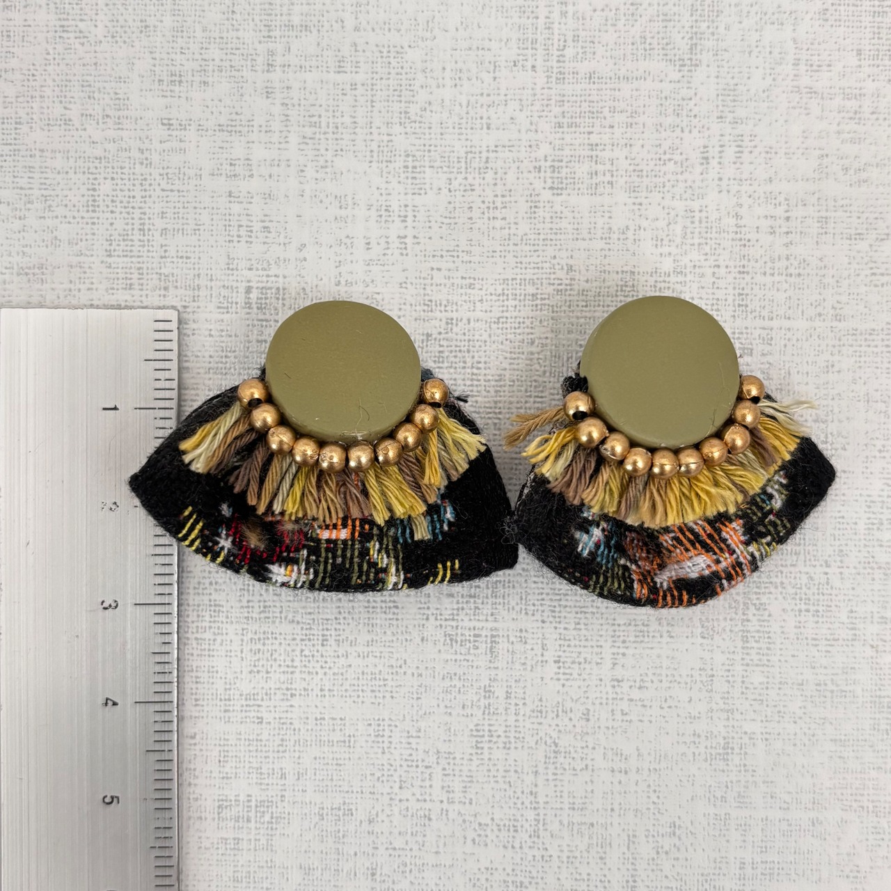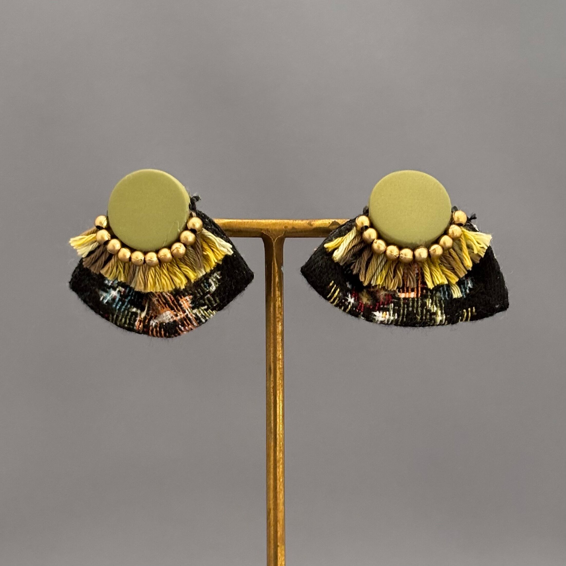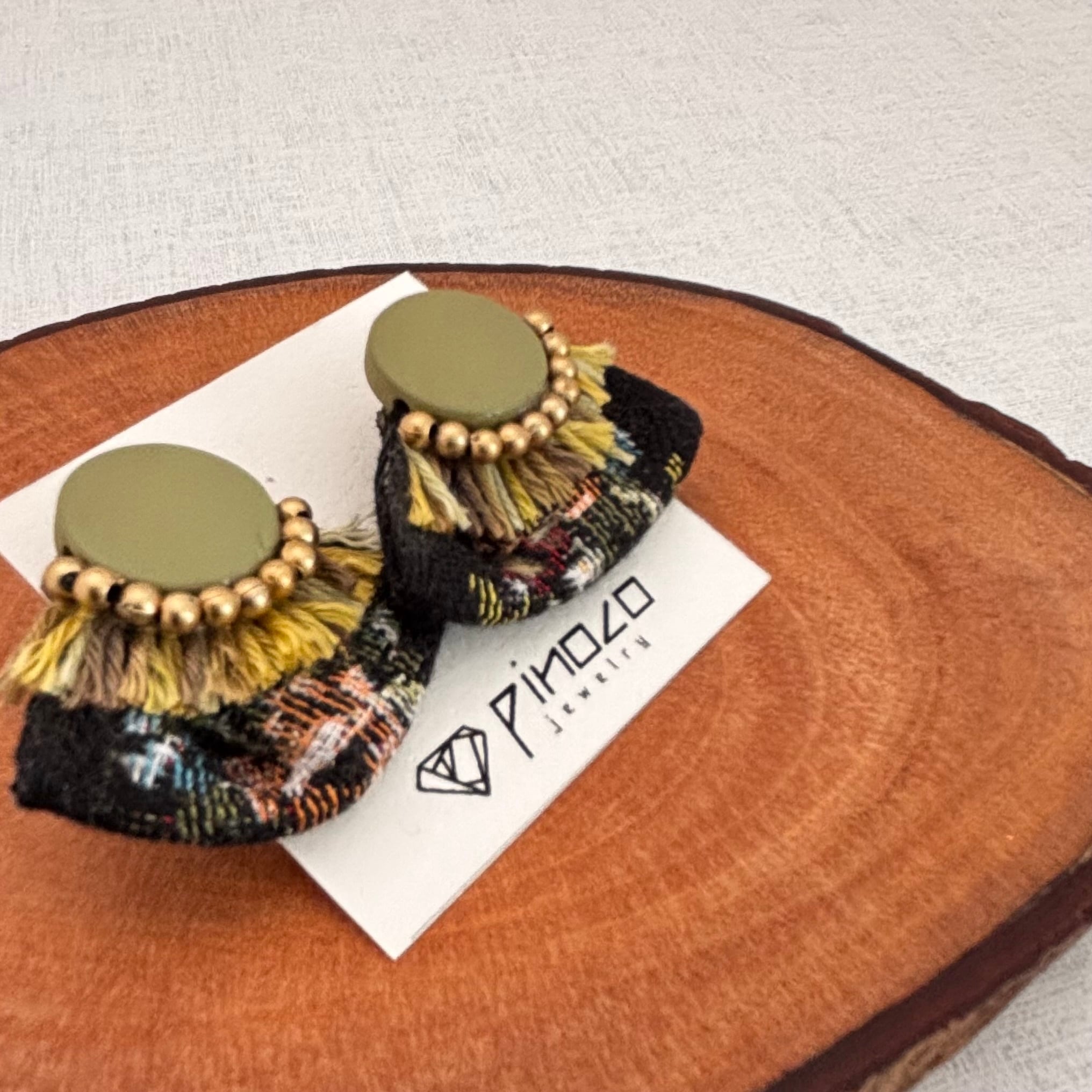 自然の温もりを感じさせるウッドの丸いパーツに、シックな刺繍糸で作られたフリンジと、クラシカルな花柄のチロリアンテープを組み合わせたデザインで、耳元でさりげなく存在感を放ちます。