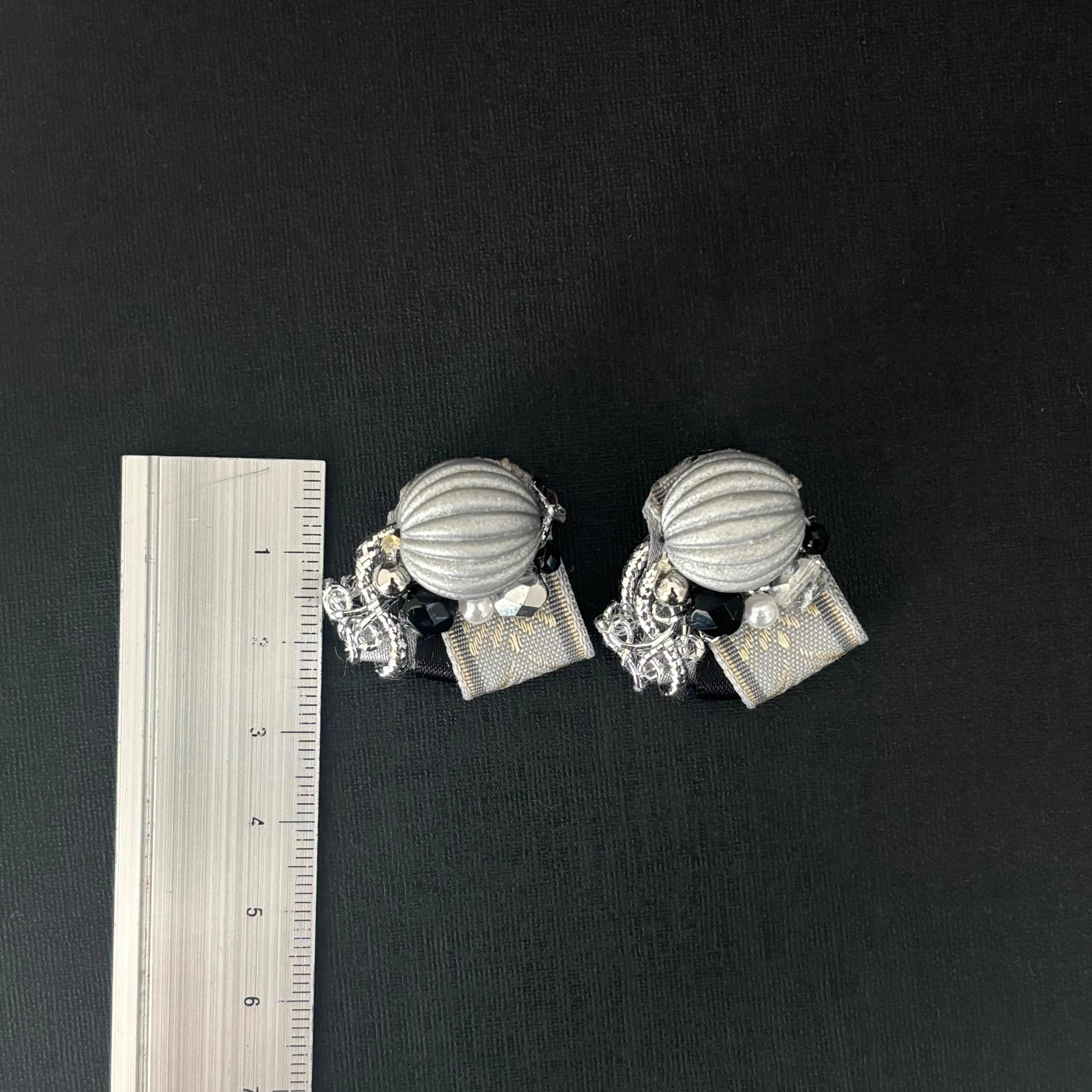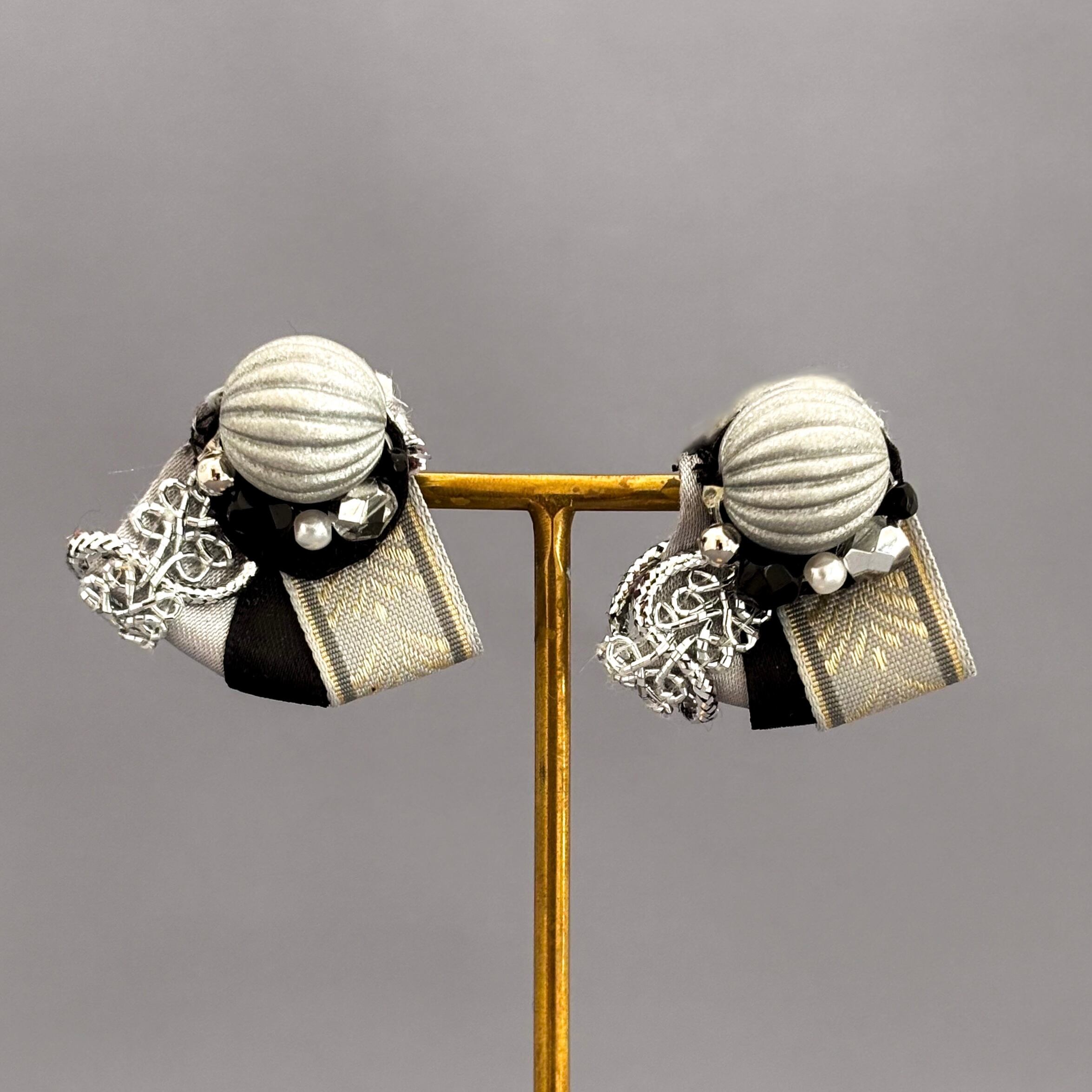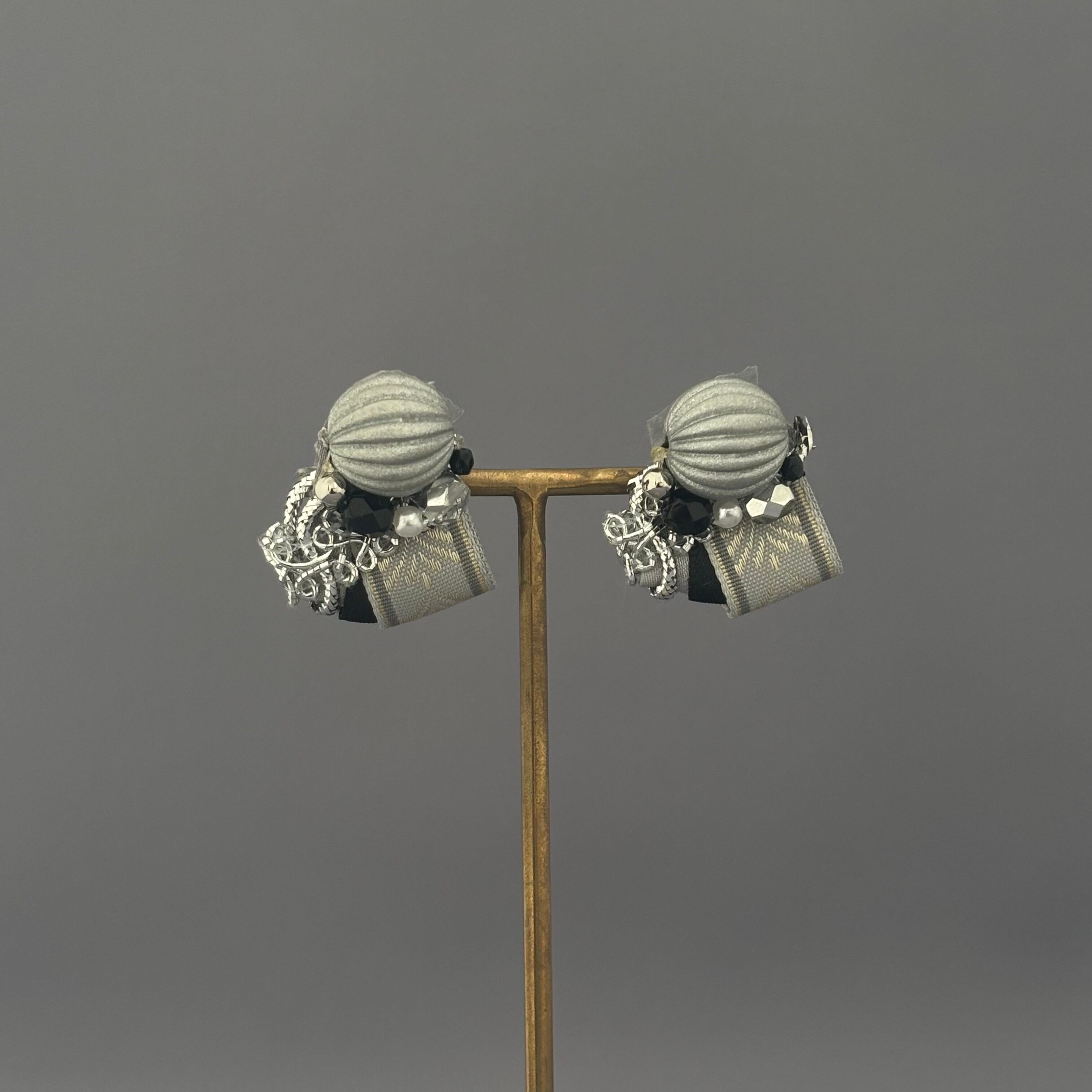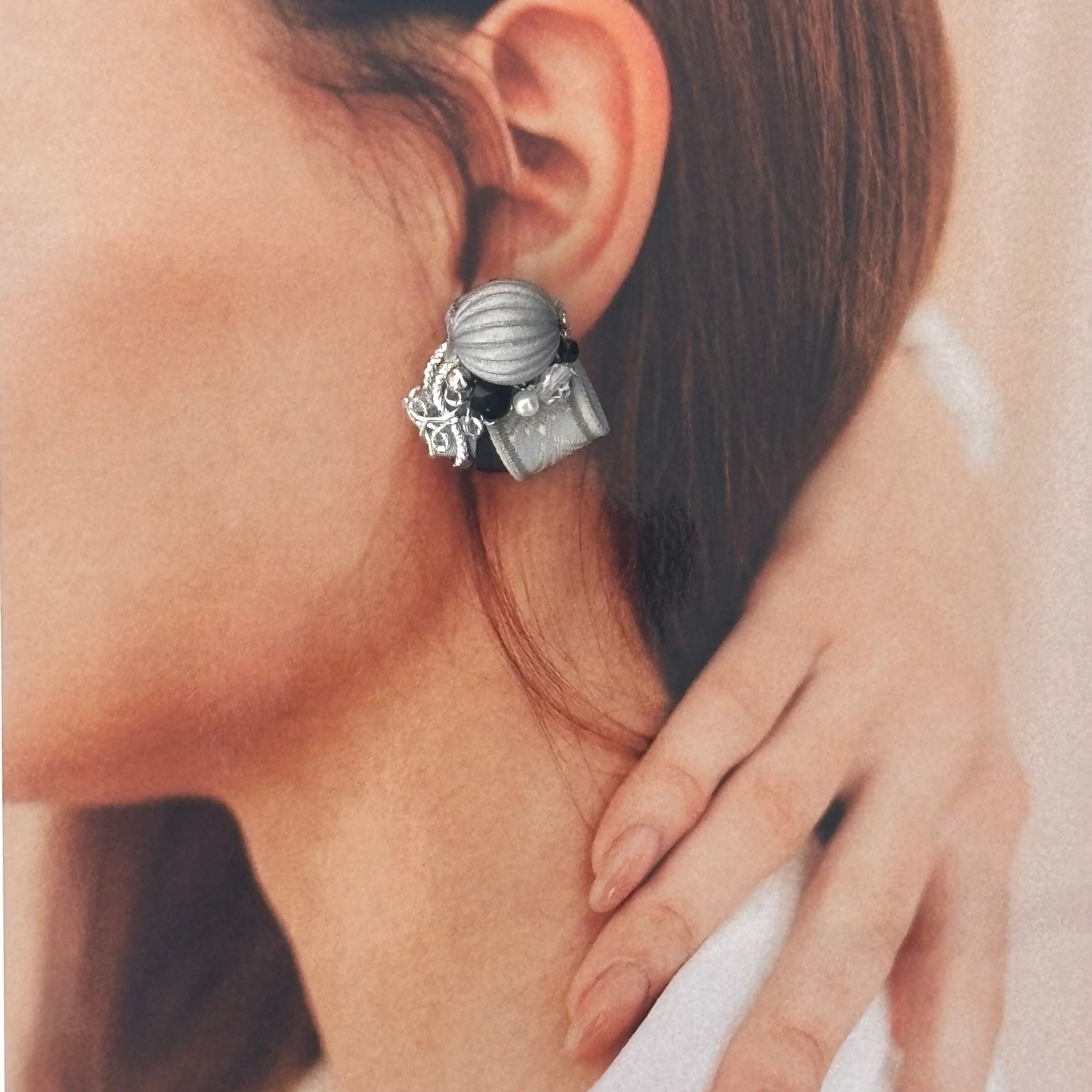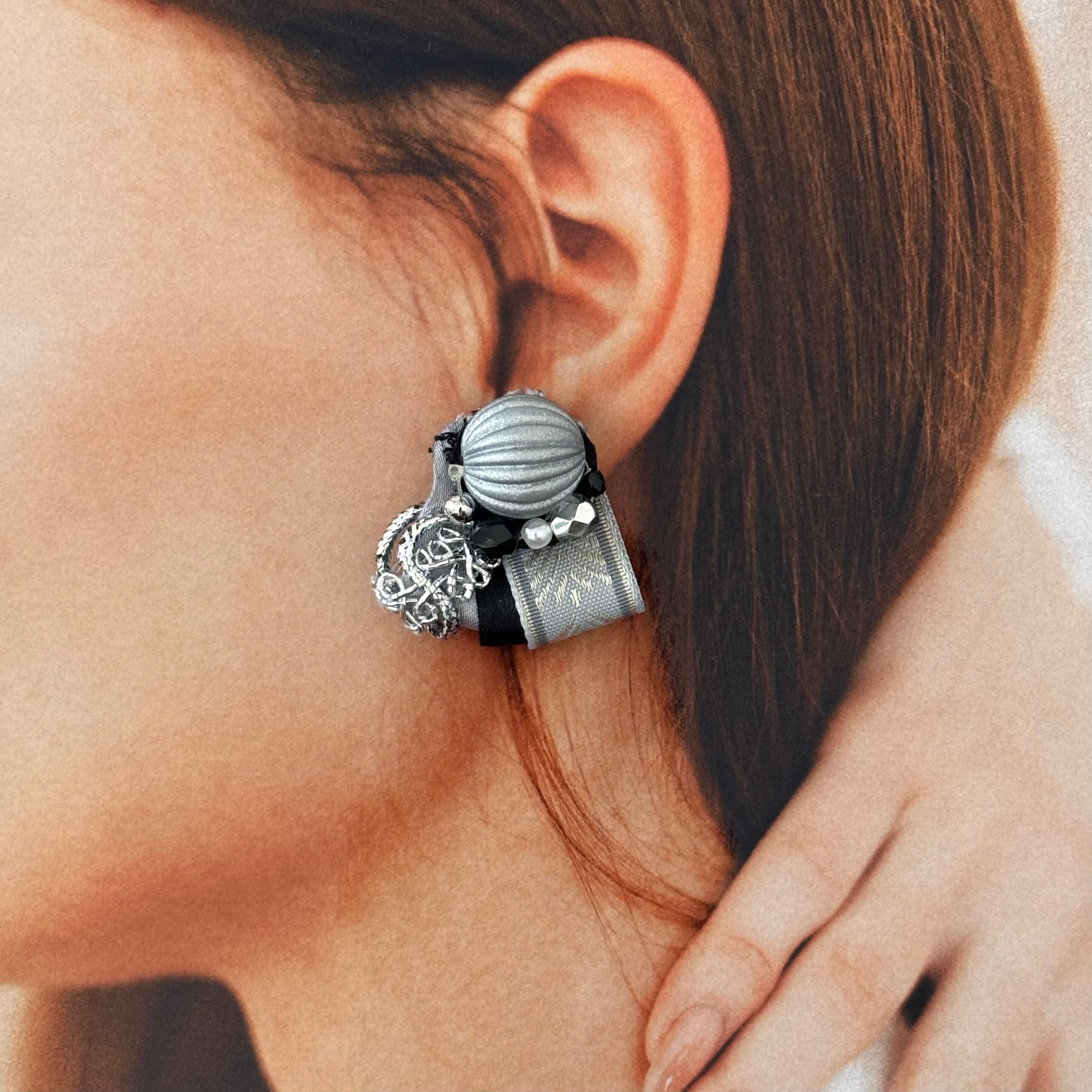 シルバーのウッドビーズをメインに、シルバー、ブラック、ライトグレーなど、様々な質感と柄のテープやビーズを組み合わせた、モダンで個性的なデザインで、耳元でさりげなく存在感を放ちます。