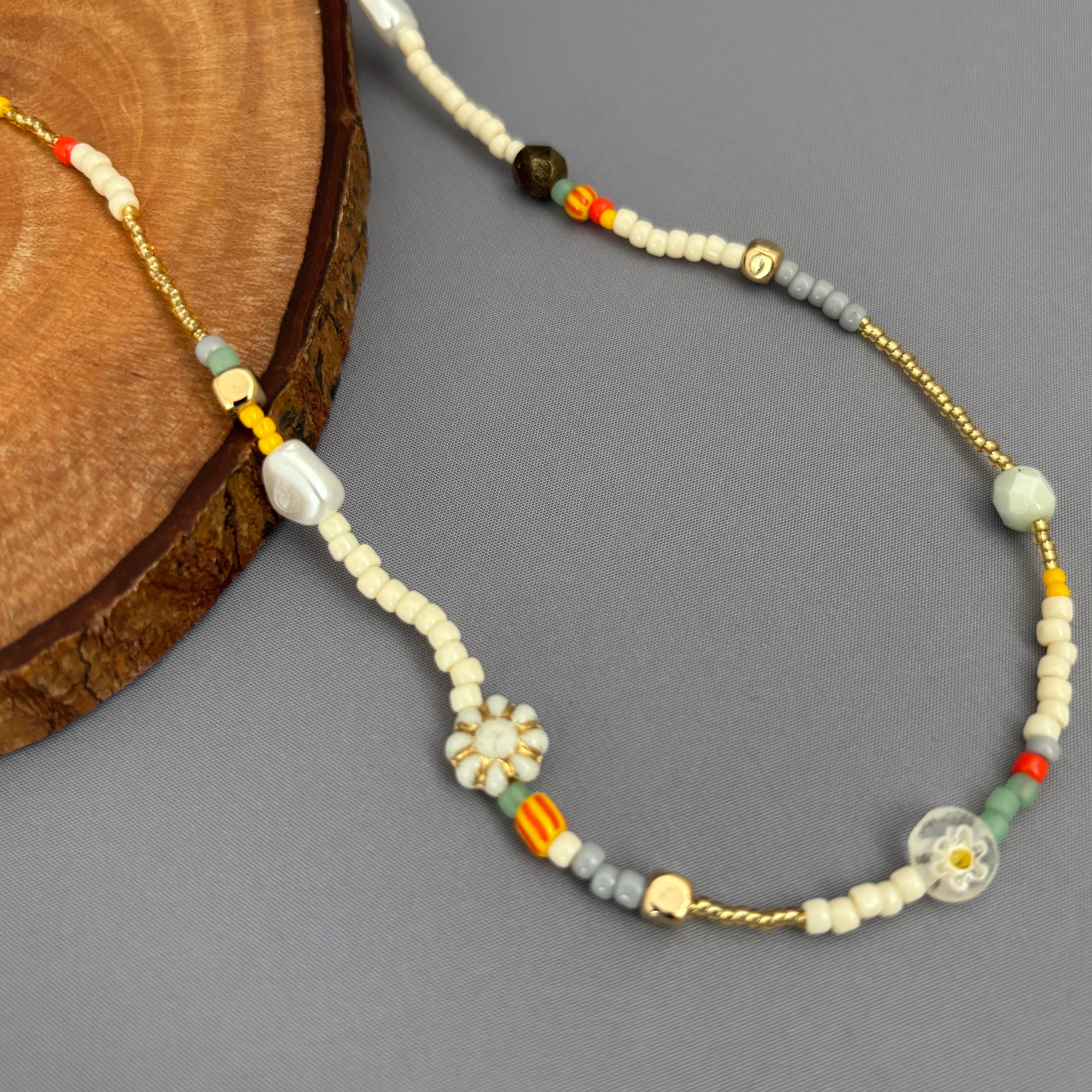 様々な色と形のビーズを組み合わせた、遊び心溢れるハンドメイドネックレスです。