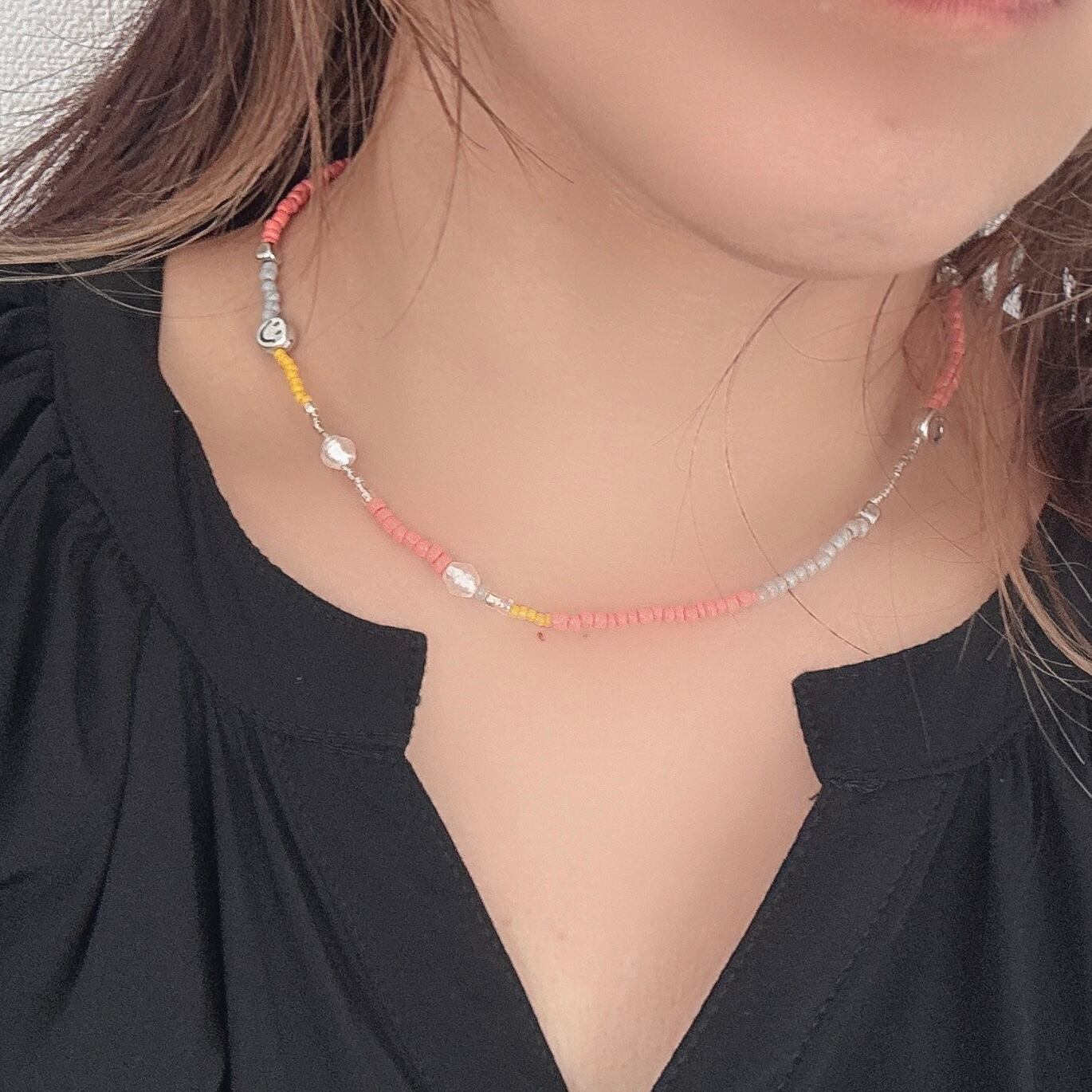 柔らかなコーラルピンクと落ち着いたグレーのビーズが交互に配され、そこにイエローや透明感のあるビーズがアクセントを加えています。
