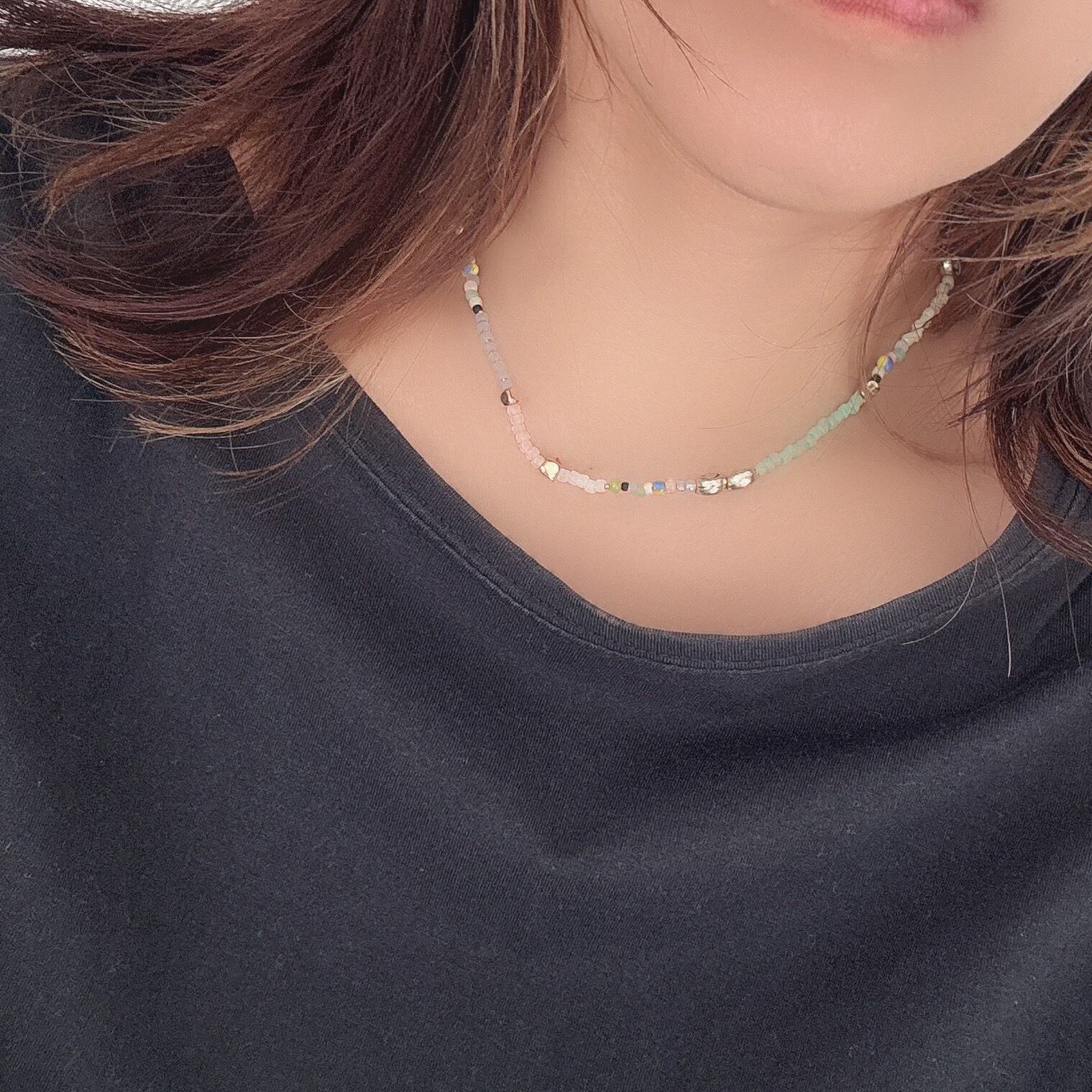 様々な色とサイズのビーズが織りなすリズム感は、手作りならではの温もりと個性を感じさせます。カジュアルなTシャツやブラウスに合わせるだけで、顔周りを明るく彩り、日常のコーディネートに楽しさを添えてくれます。