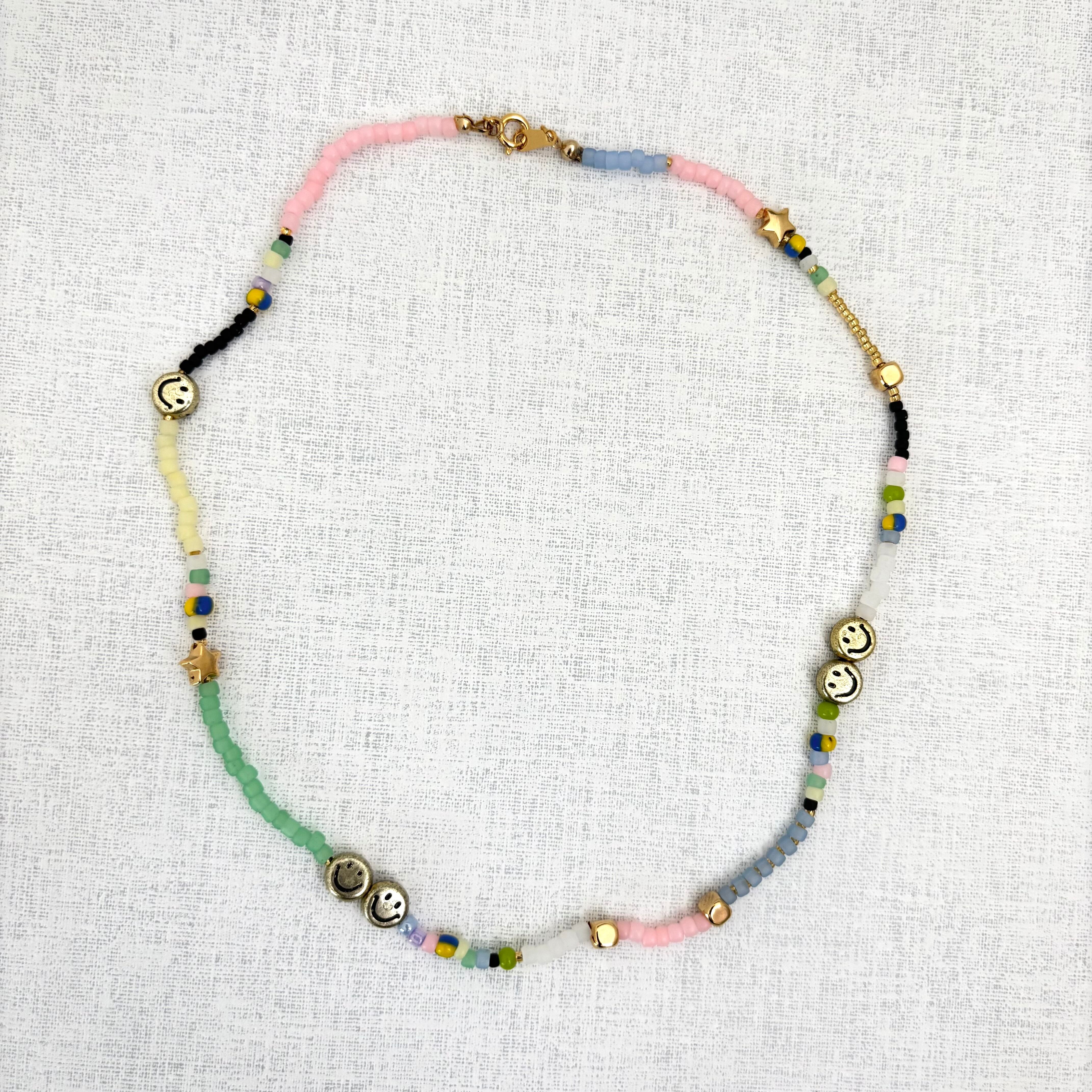 身につけるだけで心が弾むような、可愛らしいスマイルモチーフがアクセントのハンドメイドネックレスです。