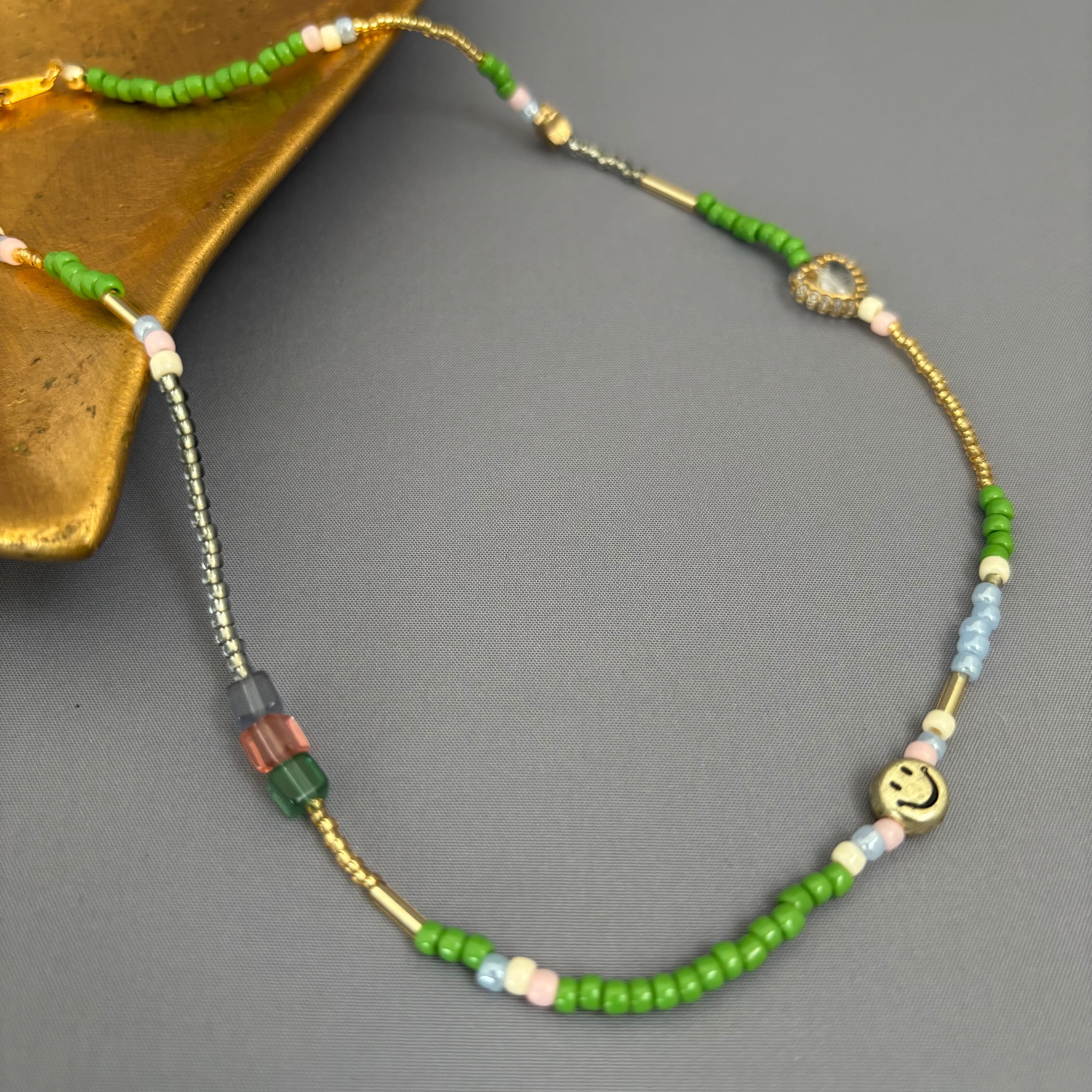 グリーンを基調とした、自然の息吹を感じさせるハンドメイドネックレスです。鮮やかなグリーンのビーズがメインに連なり、そこにゴールドの輝きや、淡いピンク、ブルー、カーキなどのビーズが散りばめられ、豊かな表情を醸し出しています。