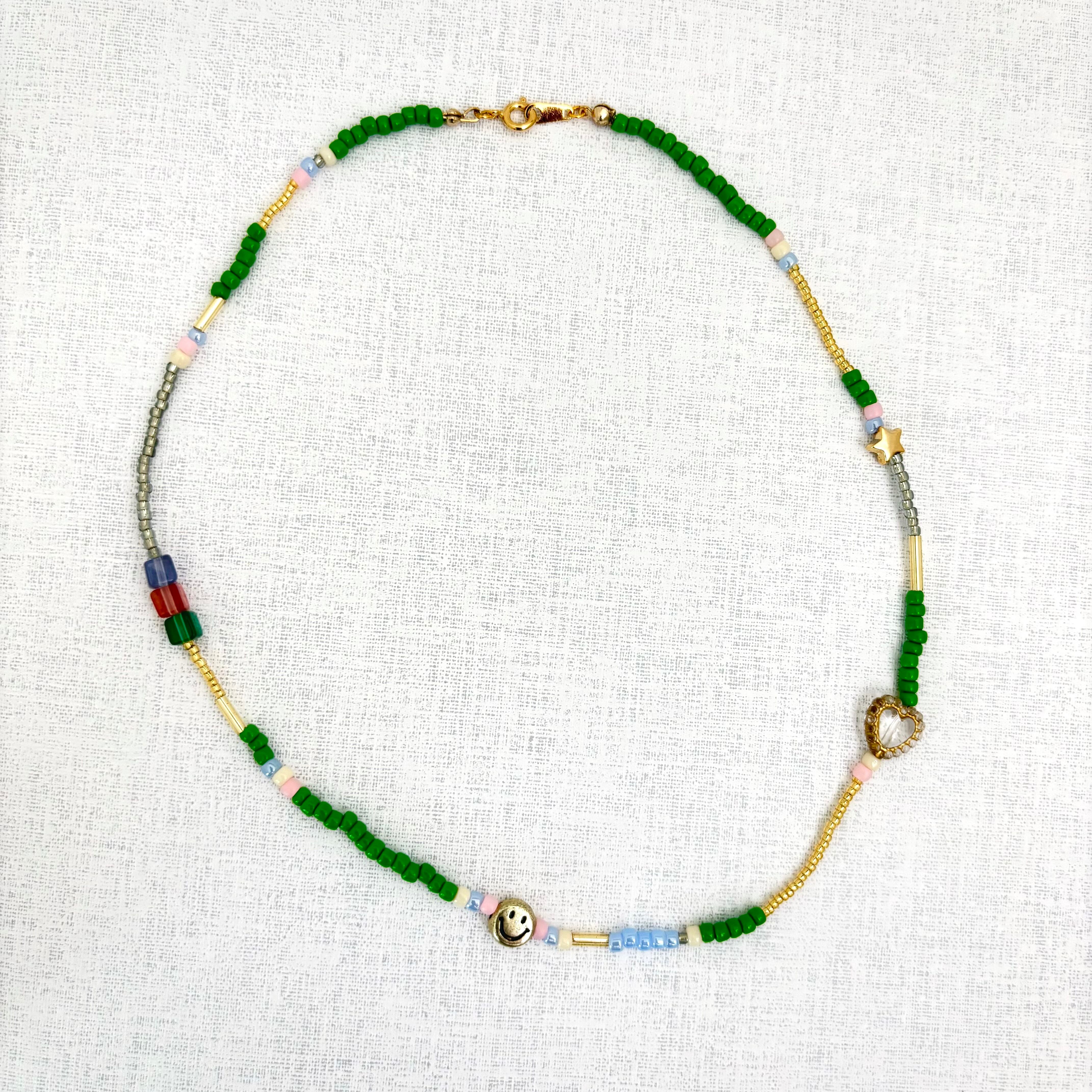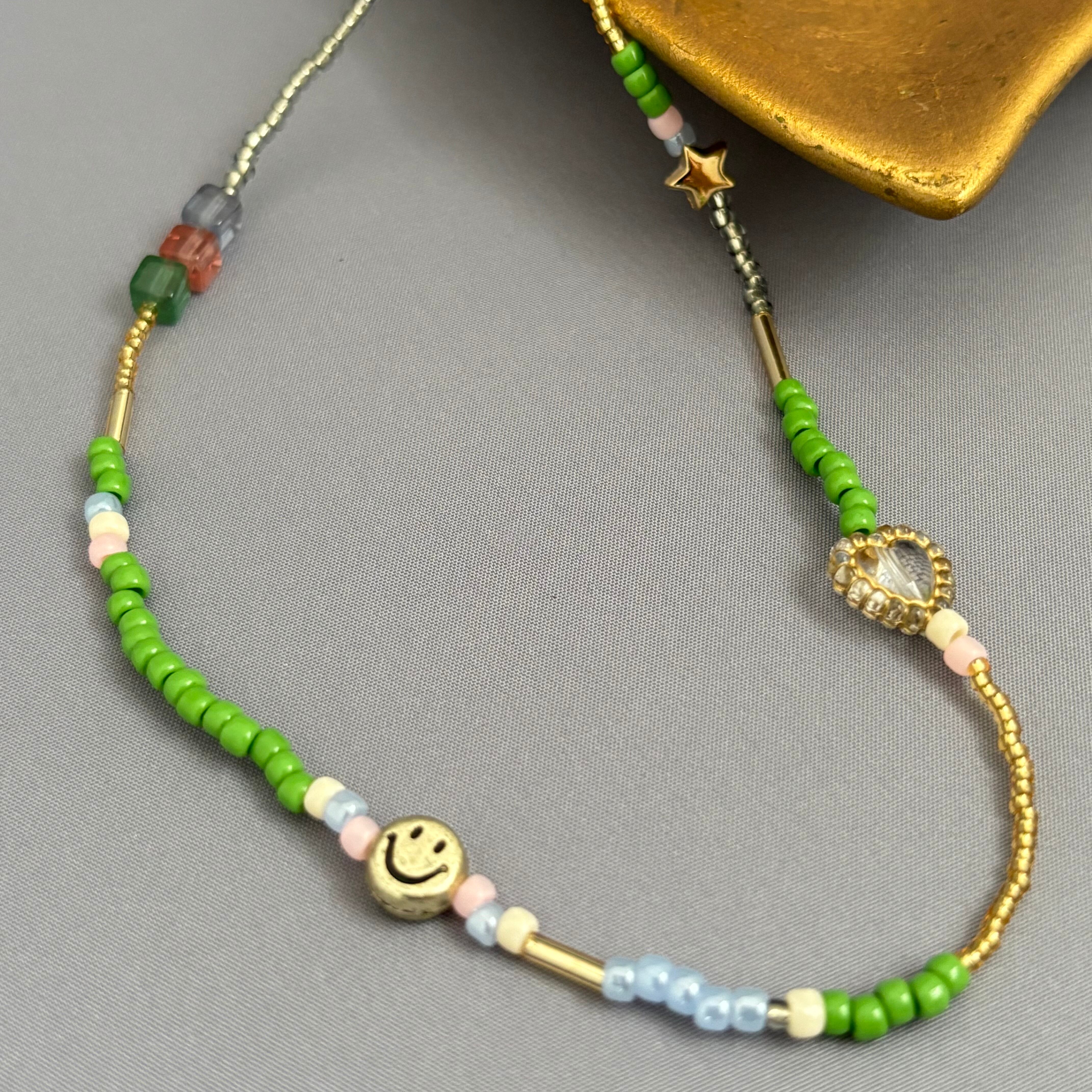 このネックレスの魅力は、様々な形や素材のチャームが織りなすハーモニー。見るたびに心が和むゴールドカラーのスマイルフェイスチャーム、愛らしい星形チャーム、そして繊細なハート型のチャームが、遊び心と個性をプラスしています。また、透明感のあるキューブ型のビーズや、メタリックな輝きを放つビーズが、光を受けてキラキラと輝きます。